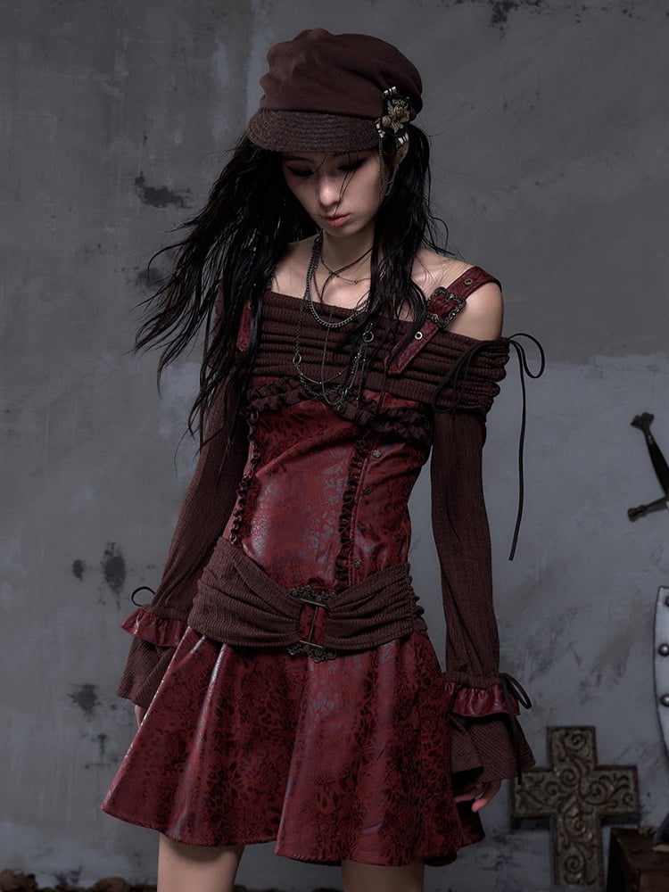Dress Sleeves Vintage PU Red Brown Punk A-Line Bell Off-Shoulder with Design Knit