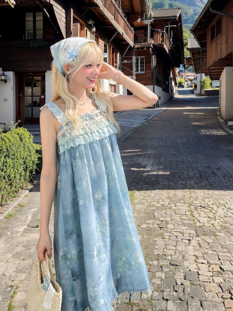 Dye Tie Charm Blue Sleeveless Dress Ruffles Bohemian Tassel Hem Shell Tiered