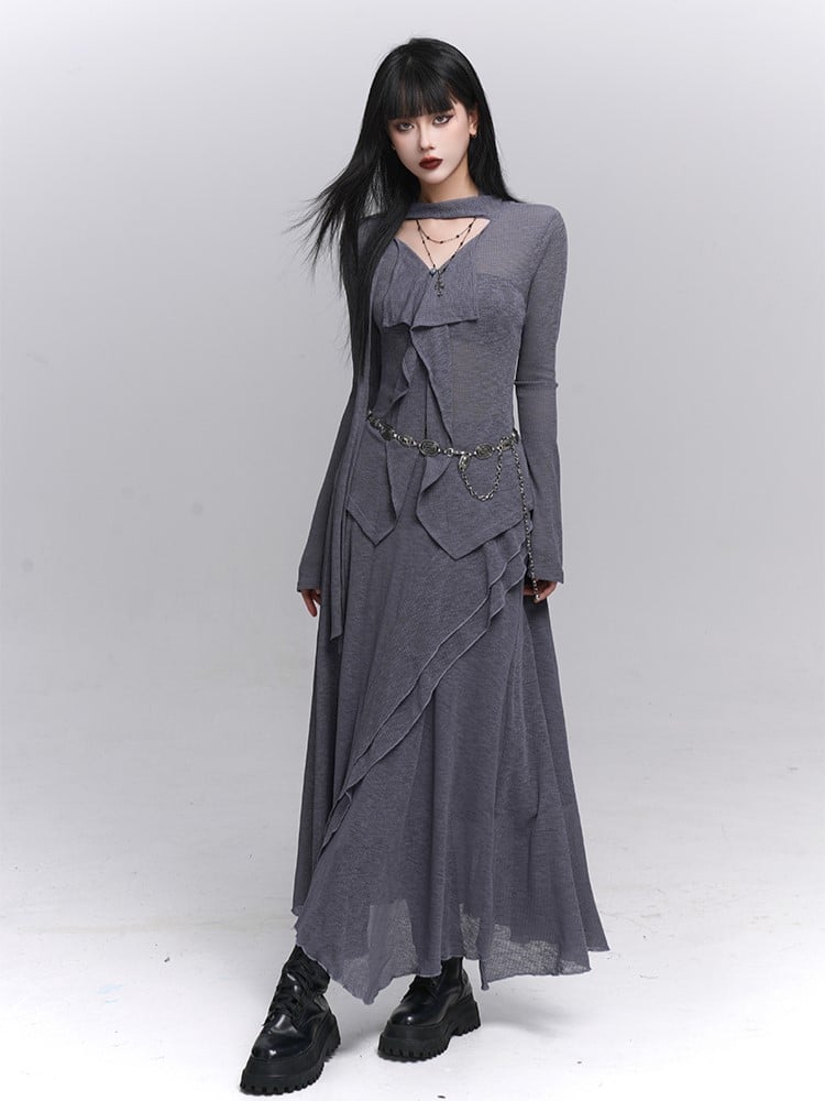 Elegant Gray Ruffle Gothic Front Attached with Neck Top V-Neck