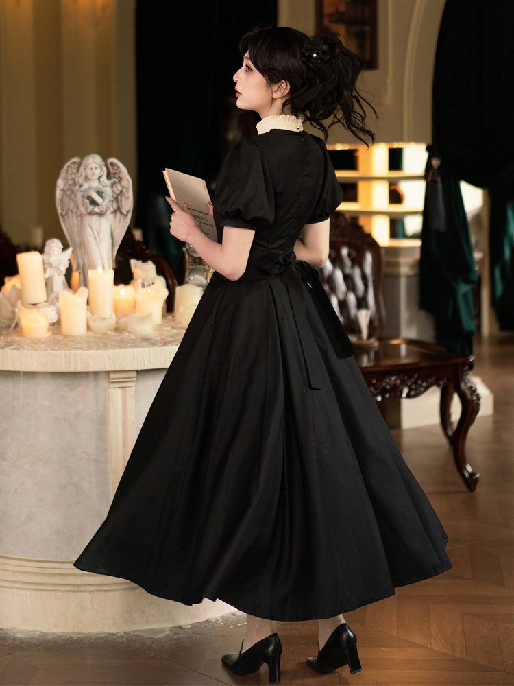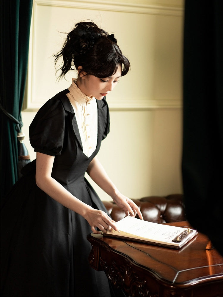Black Slim Waist Elegant Dress Beige Ruffle Neckline Short Sleeves Lolita One Piece