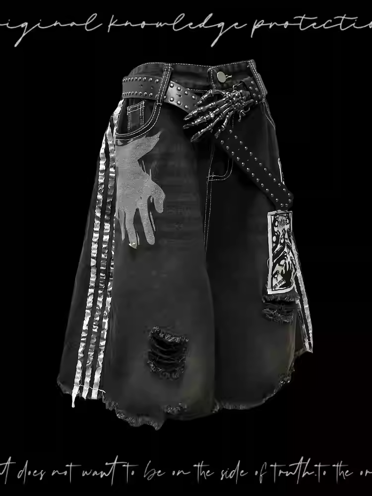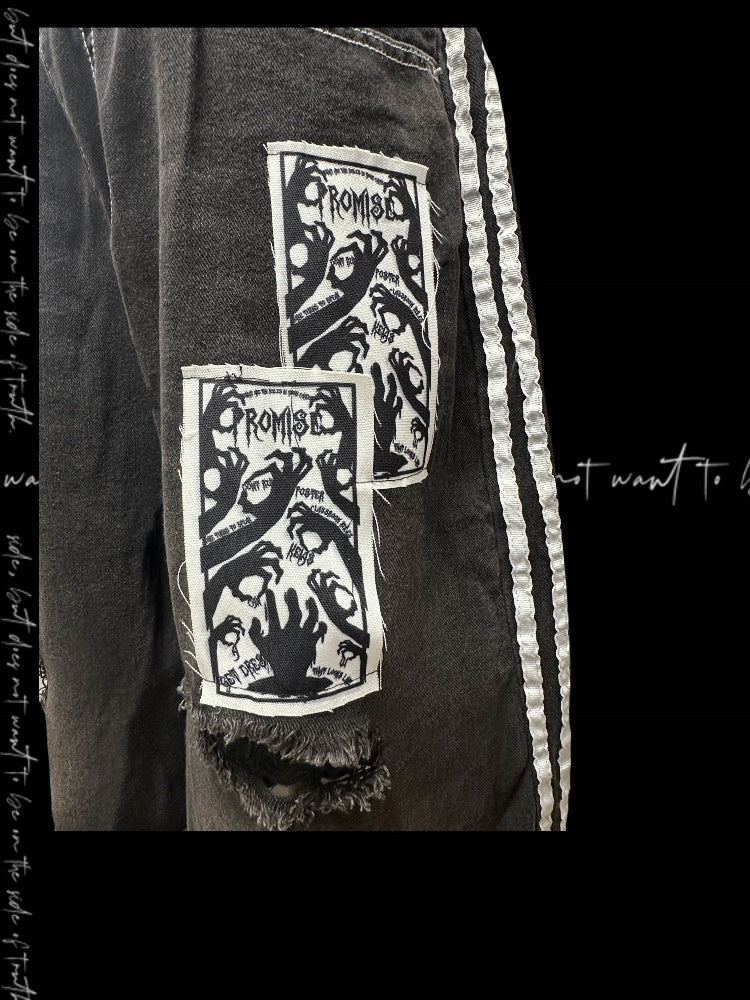 Embellished Distressed Holes Stripes Raw Hem Appliques Black White Denim Shorts