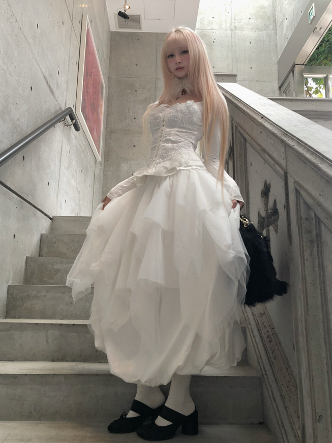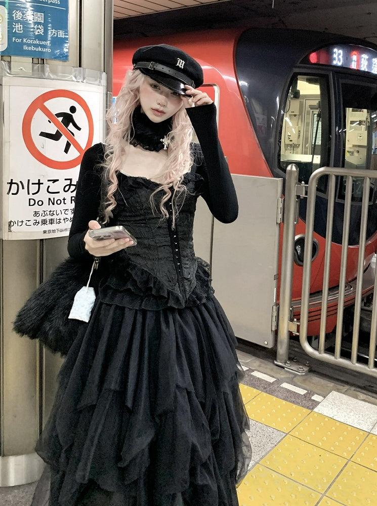 Embossed Lace-Up Back with Jacquard Lace Black/White Top Sleeve Frill Long