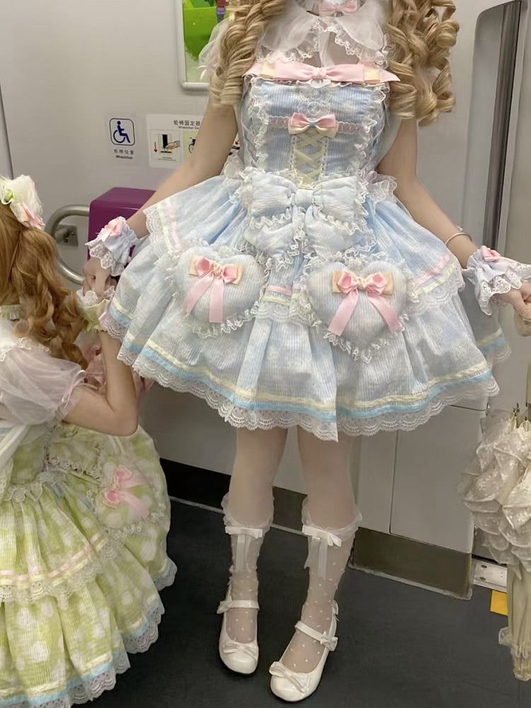 Blue Rosette Fabric Padded Bow and Heart Decoration Lolita Jumper Skirt