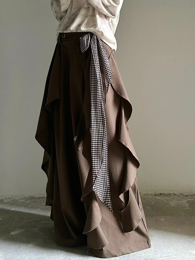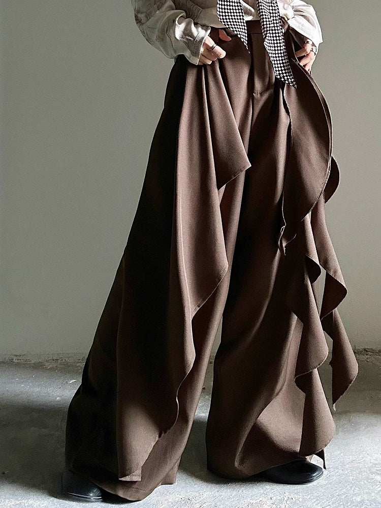 Ornate Cascading Ruffles with Functional Button & Zip Fastening Brown Wide-leg Pants in Princely Style