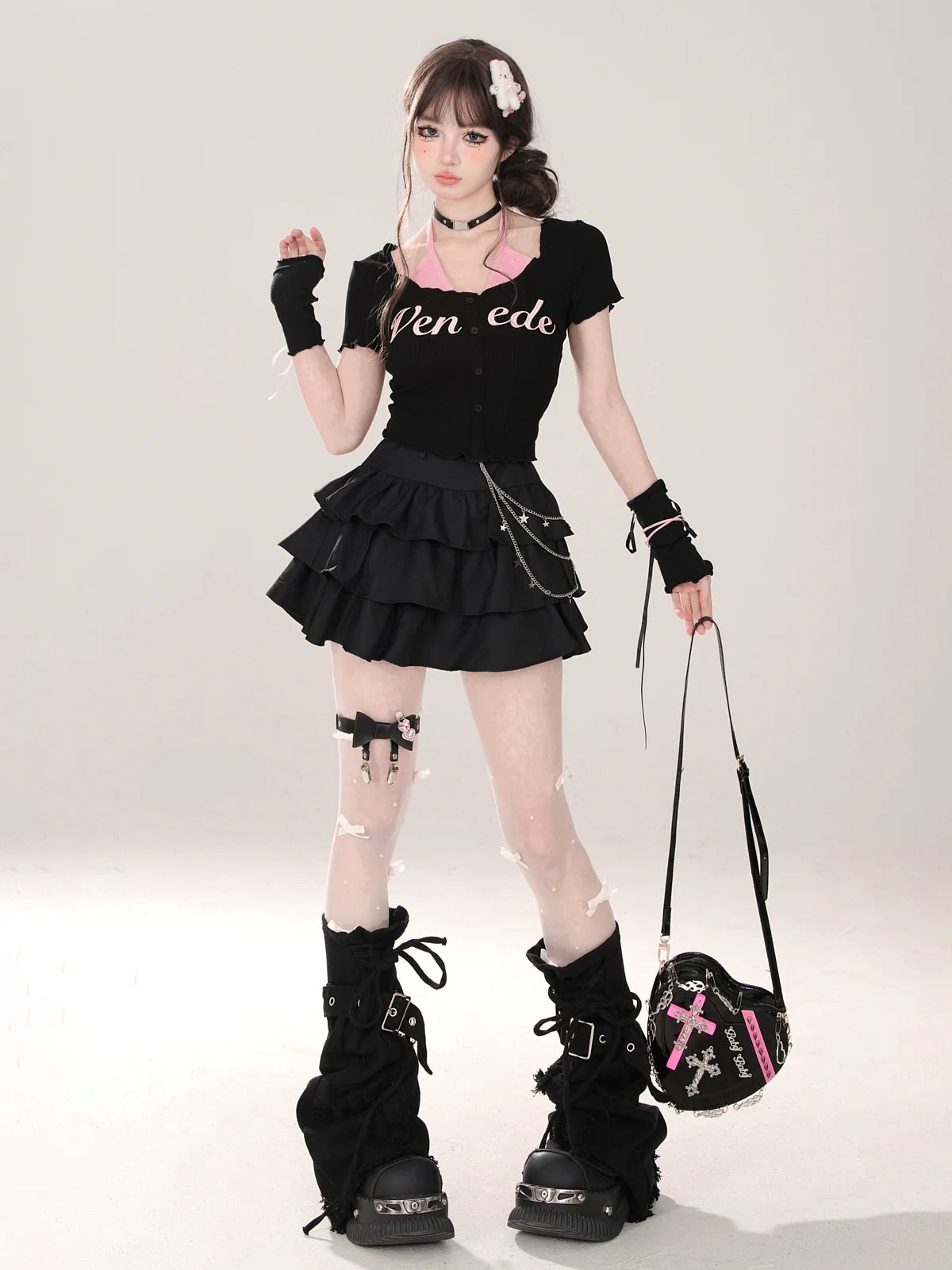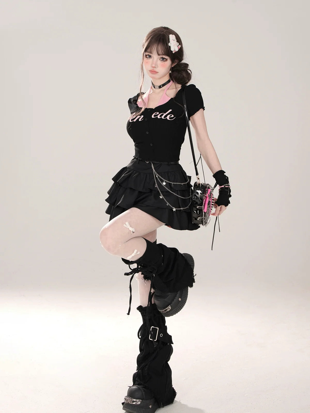This adorably styled two-piece set includes a faux short halter neck top and a complementary U-neck t-shirt. Perfect for a cute and casual look, this set is sure to elevate your wardrobe.