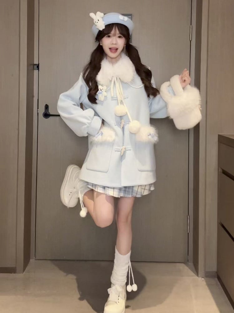Blue Sweet Lolita Winter Coat with Faux Fur Trim and Pom-Pom Accents