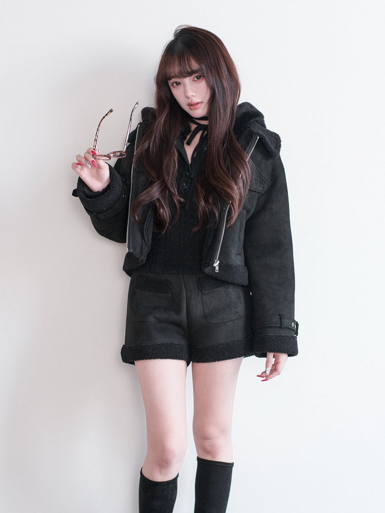 Jirai Kei Black Fleece Trim Shorts with Decorative Pocket Design