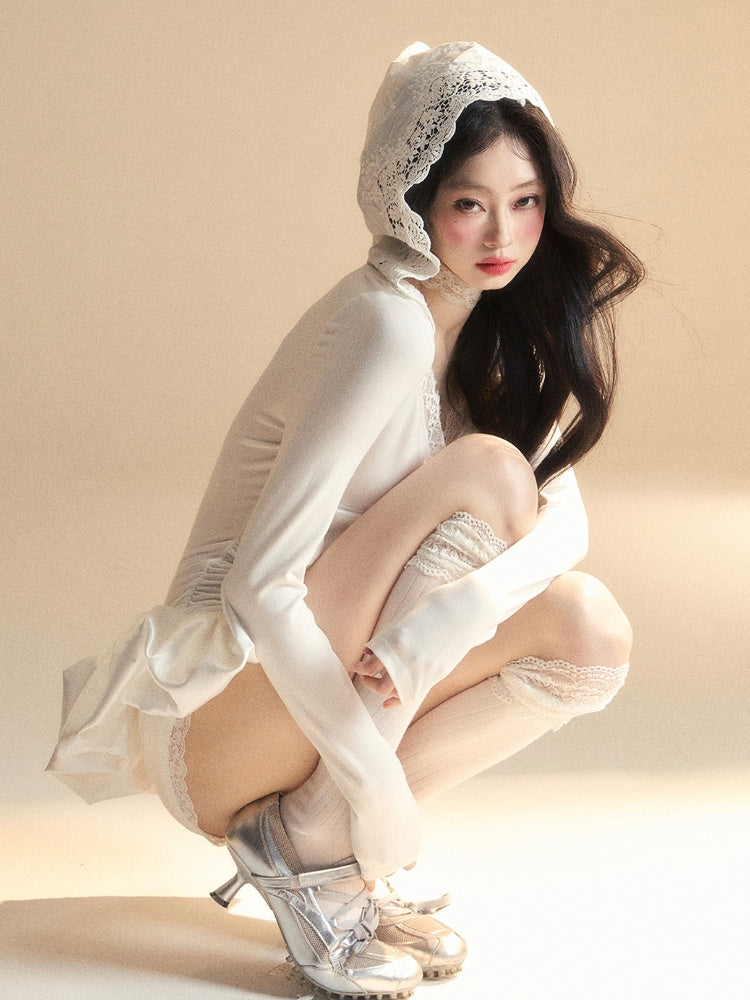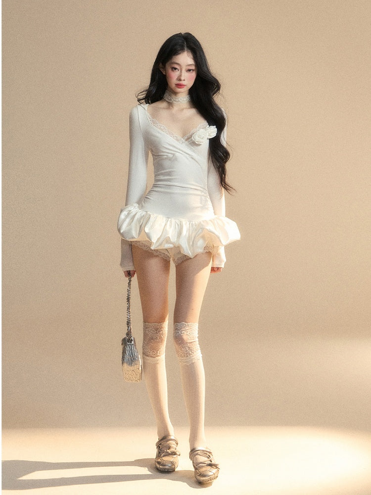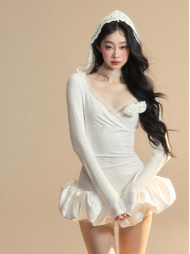 White V-Neck Floral Accents Lace Trim Glamorous Bubble Skirt Mini Hooded Dress