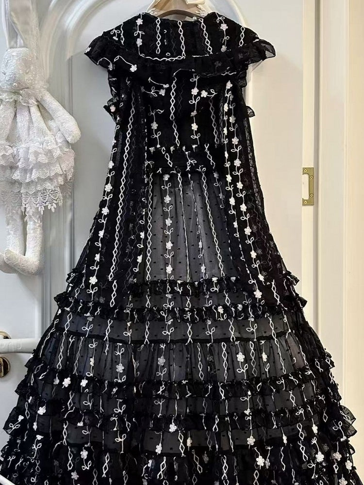 Black Floral Pattern Ruffled Lolita Overdress with Bunny Ear Hood