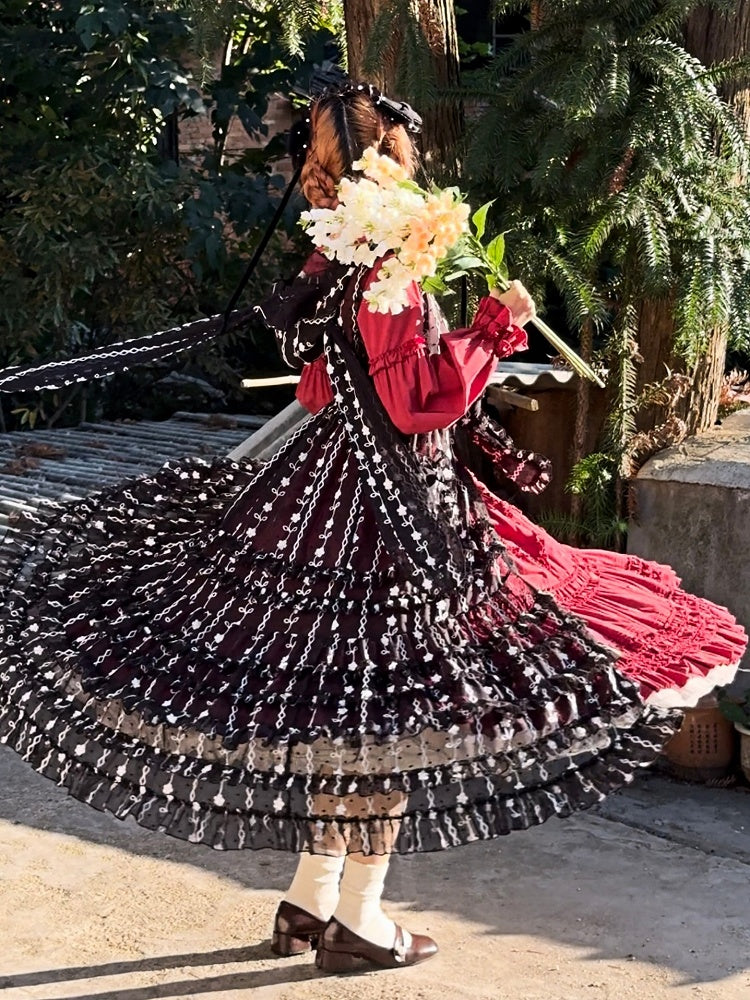 Floral Ear with Overdress Ruffled Pattern Hood Lolita Black Bunny