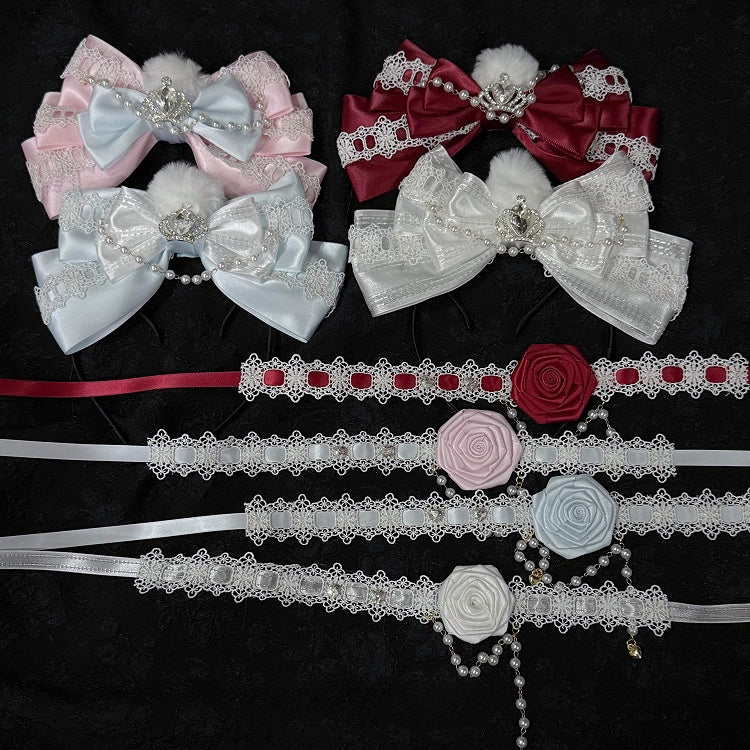 Hime Lolita Four-Color KC & Necklace Set - Bow Headpieces & Floral Lace Chokers, Handmade Sweet Elegant Collection