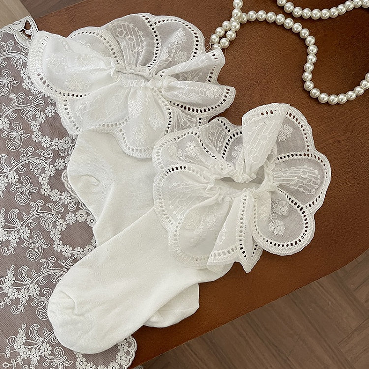 Floral White Pattern Socks Trim Calf with Black/White Lace