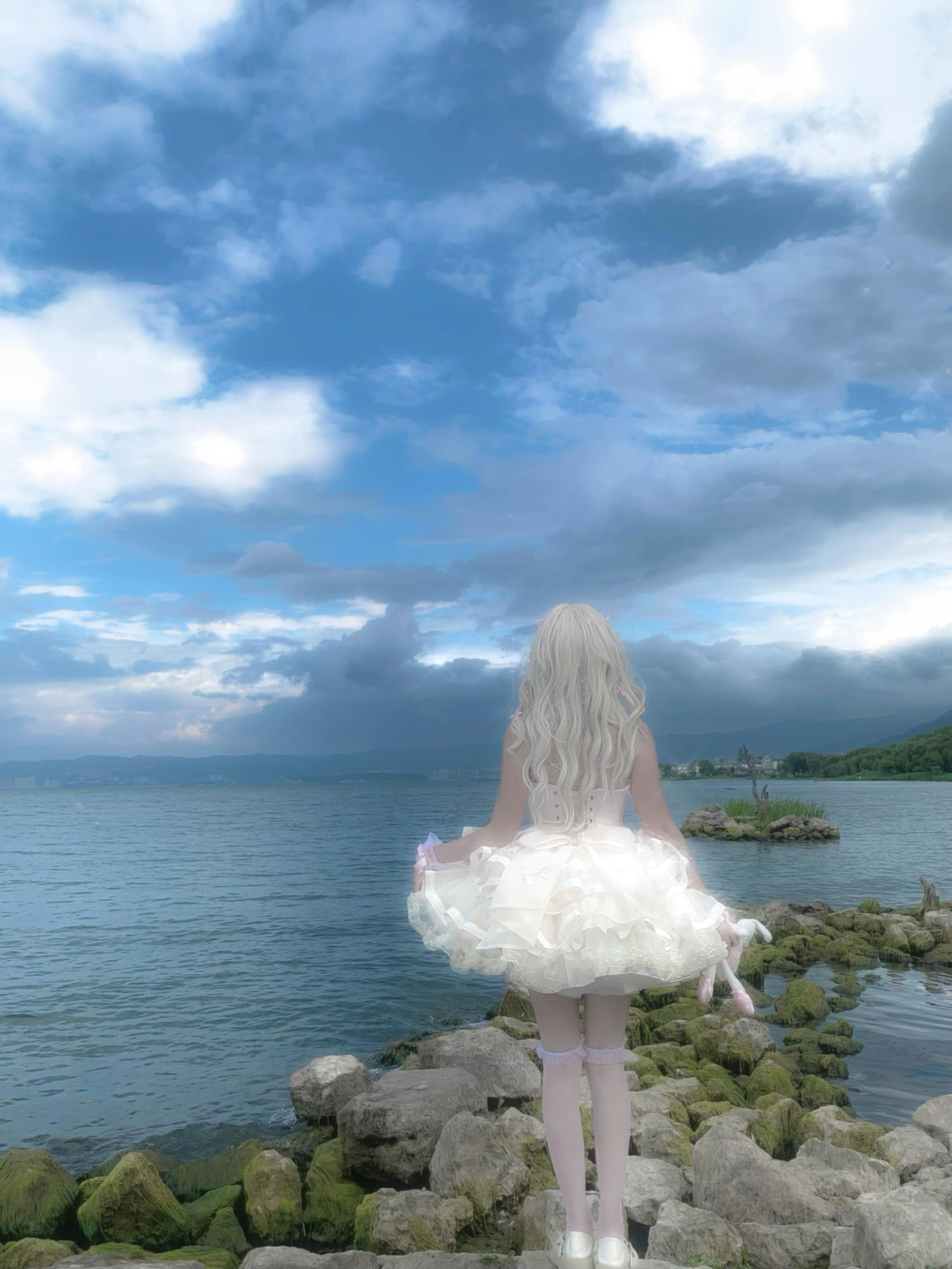 Blue and White Old School Lolita Fashion Dress Bowknot Detais JSK Set