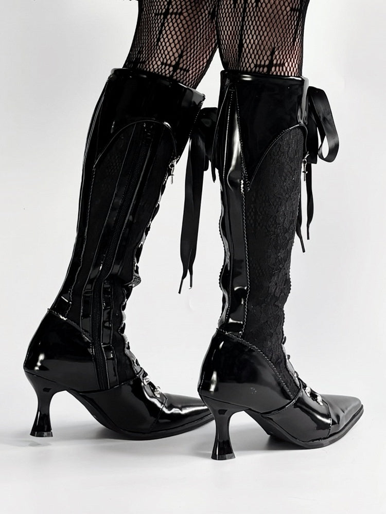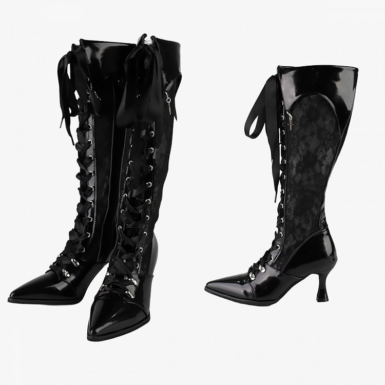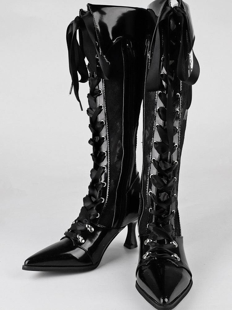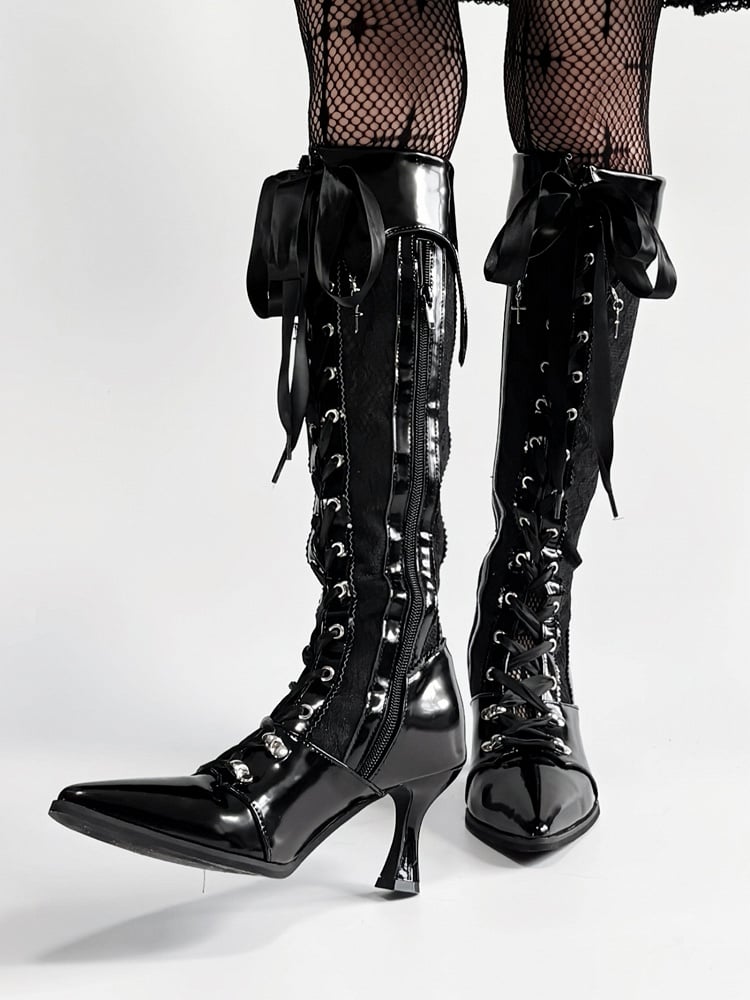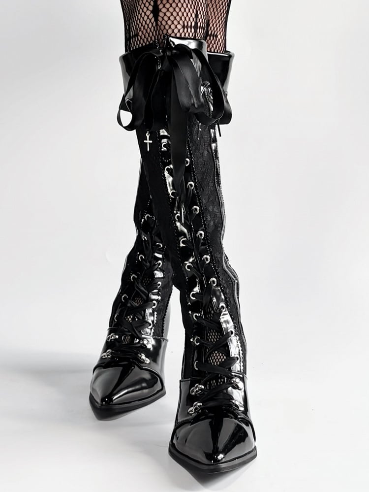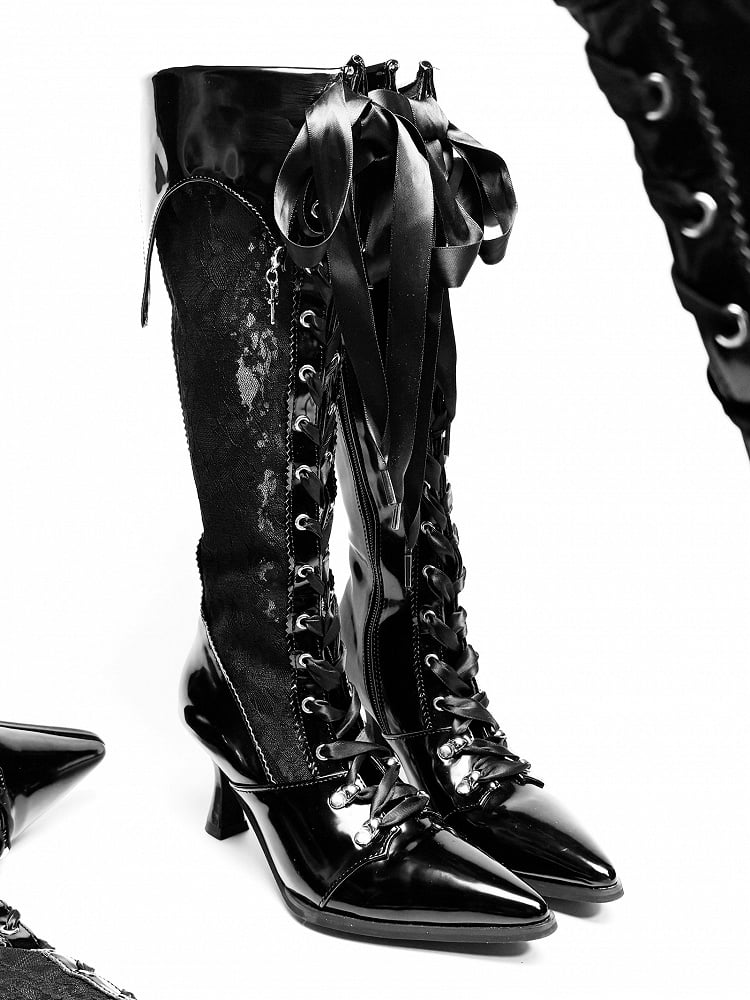 Fold-Over Cuff, Detachable Cross Ornament & Multi-Fastening Design Black High-heel Boots in Gothic Style