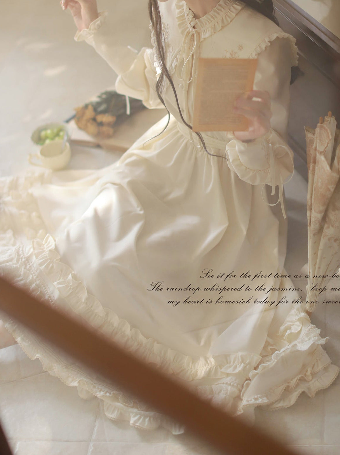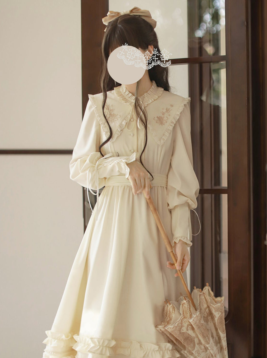 French Vintage Waist Dress Romantic Embroidery Ribbon