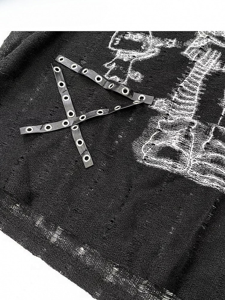 Black Off-the-shoulder Neckline Cartoon Girl Print Studs Details T-shirt