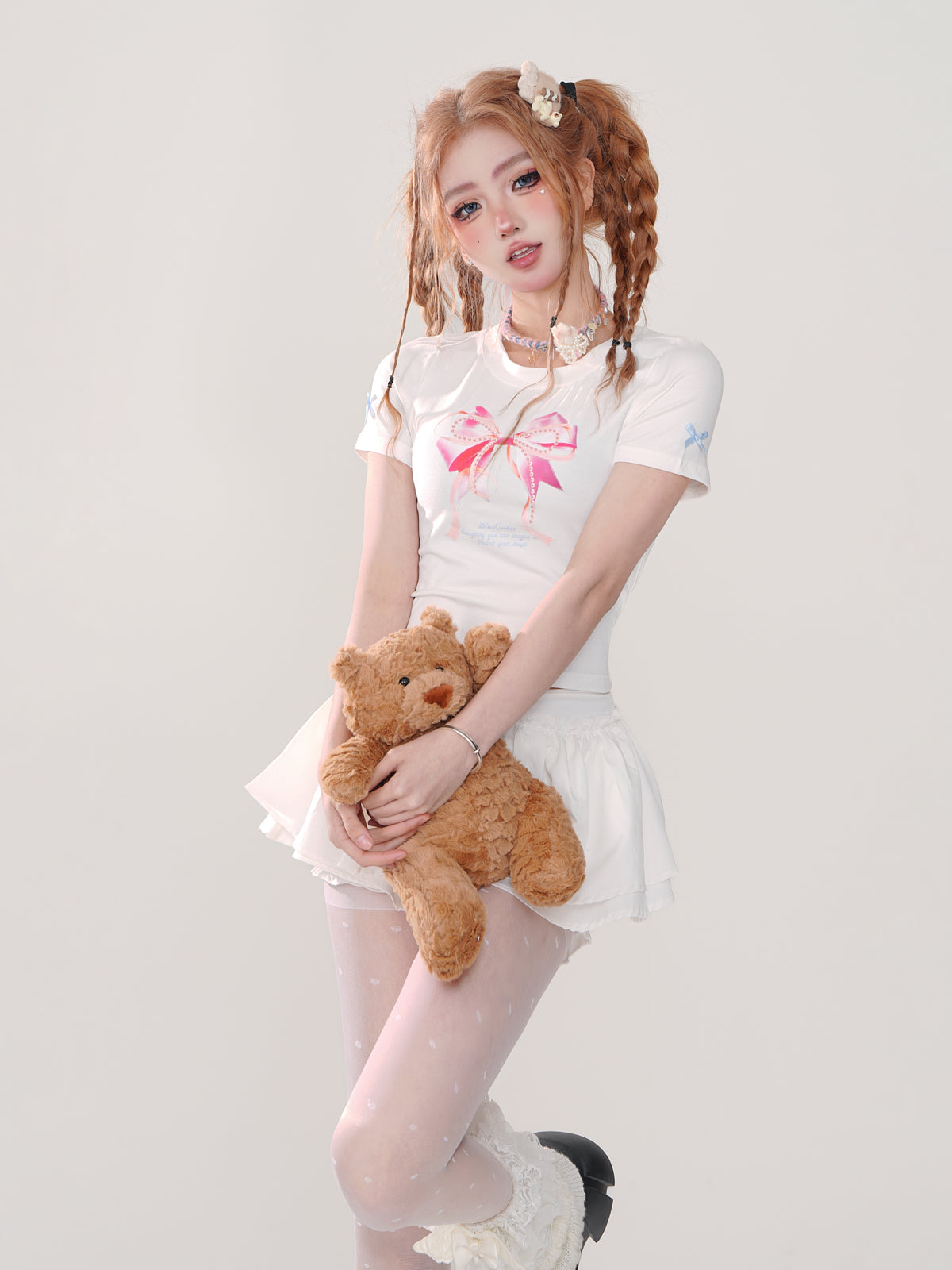 This adorable t-shirt features a delicate ribbon print, perfect for adding a feminine touch to any outfit. Its short length offers a cute and playful look, making it a versatile addition to your wardrobe. Bring out your girly side with this stylish and charming t-shirt.