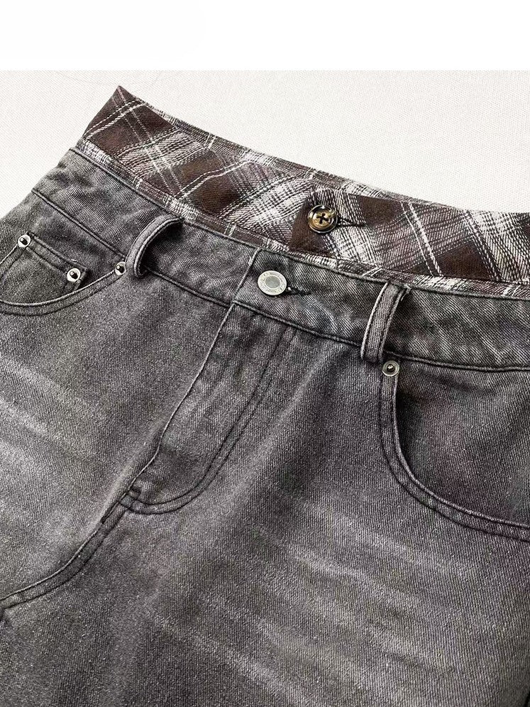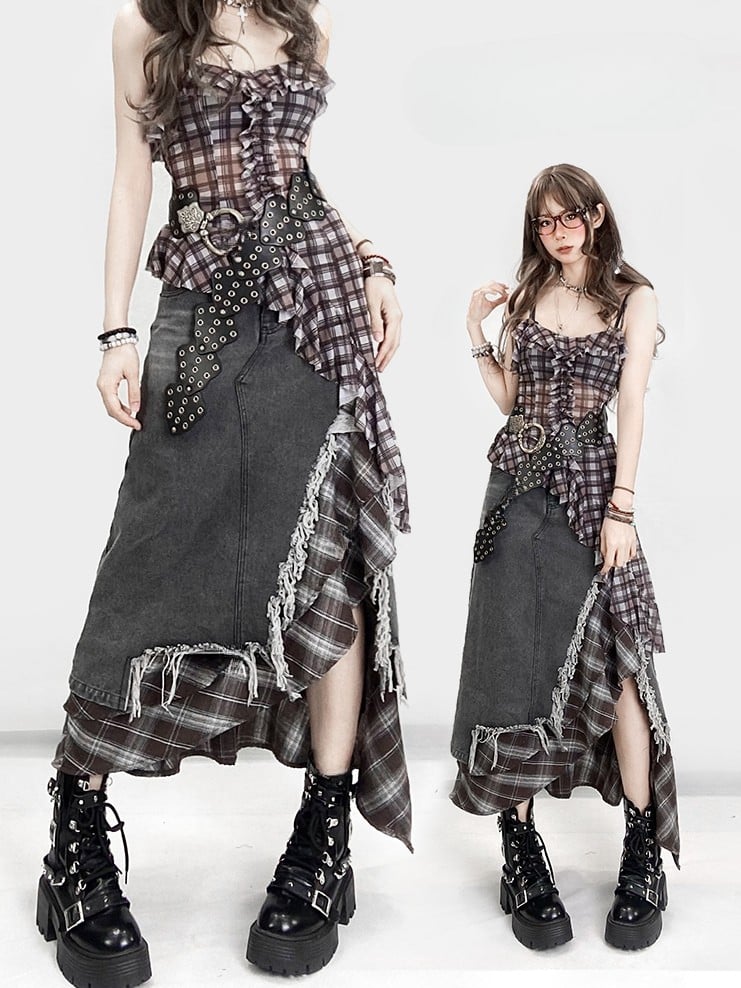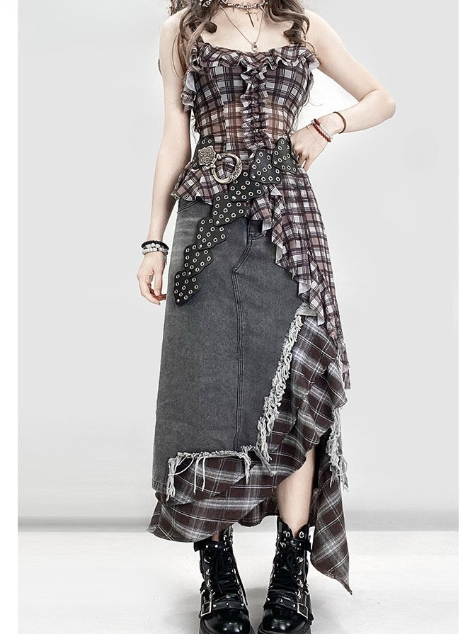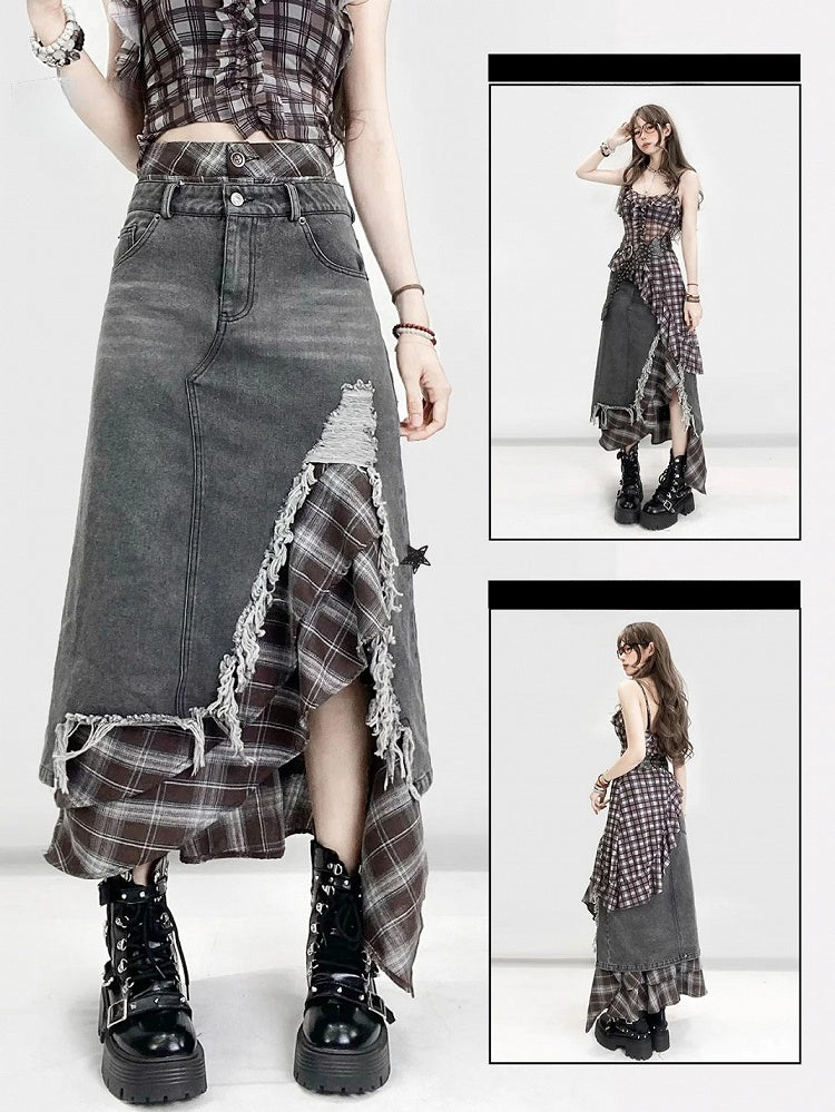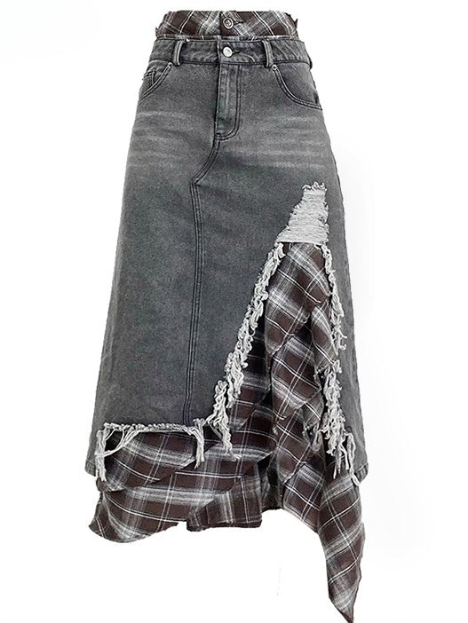 ● Asymmetrical Flounce Hem / Distress Trim / Plaid