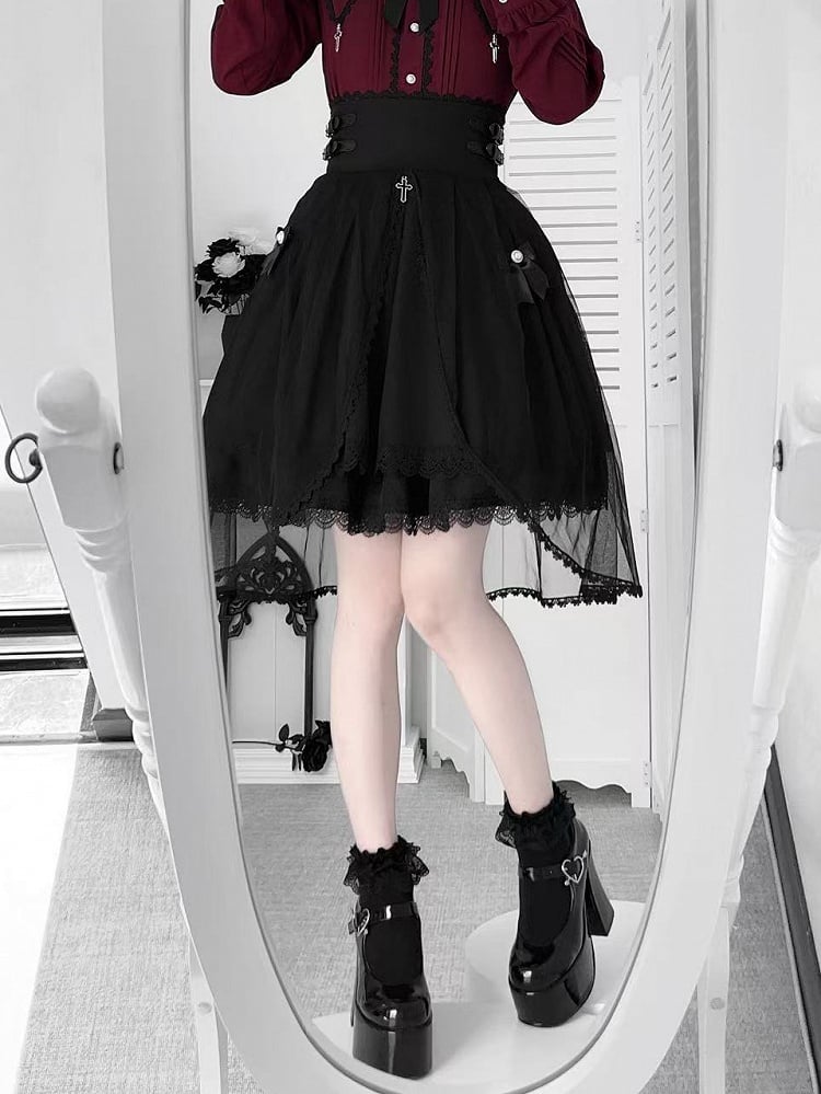 Gothic Jirai Kei Black High-Waist Skirt with Mesh Overlay & Cross Charm