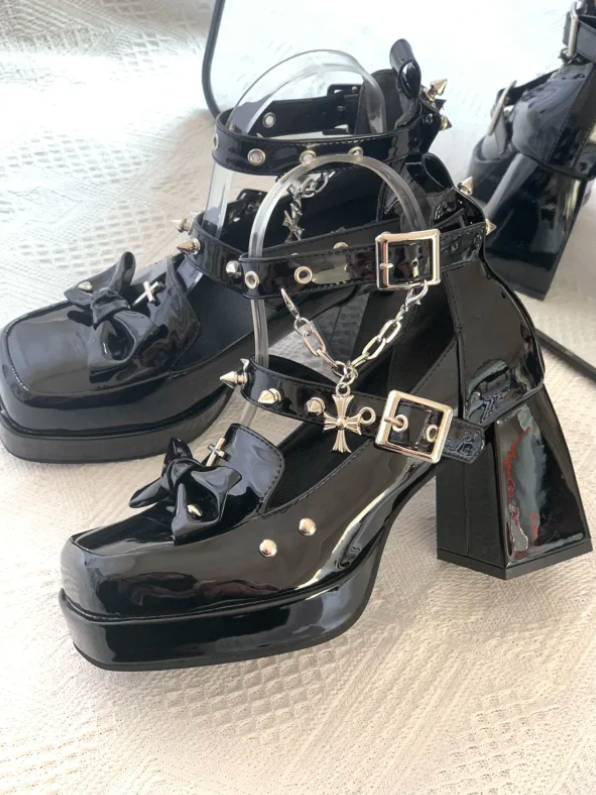 Gothic Polished Black High-heel Mary Janes with Snap Design, Detachable Cross Charm Chain & Studded Accents