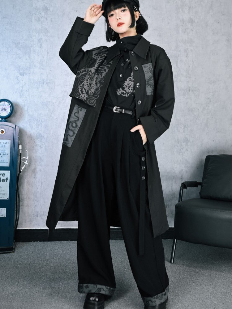 Gothic Black Cheongsam Five-Poison Print Cuffed Wide-Leg Pants with Flowing Tie Details