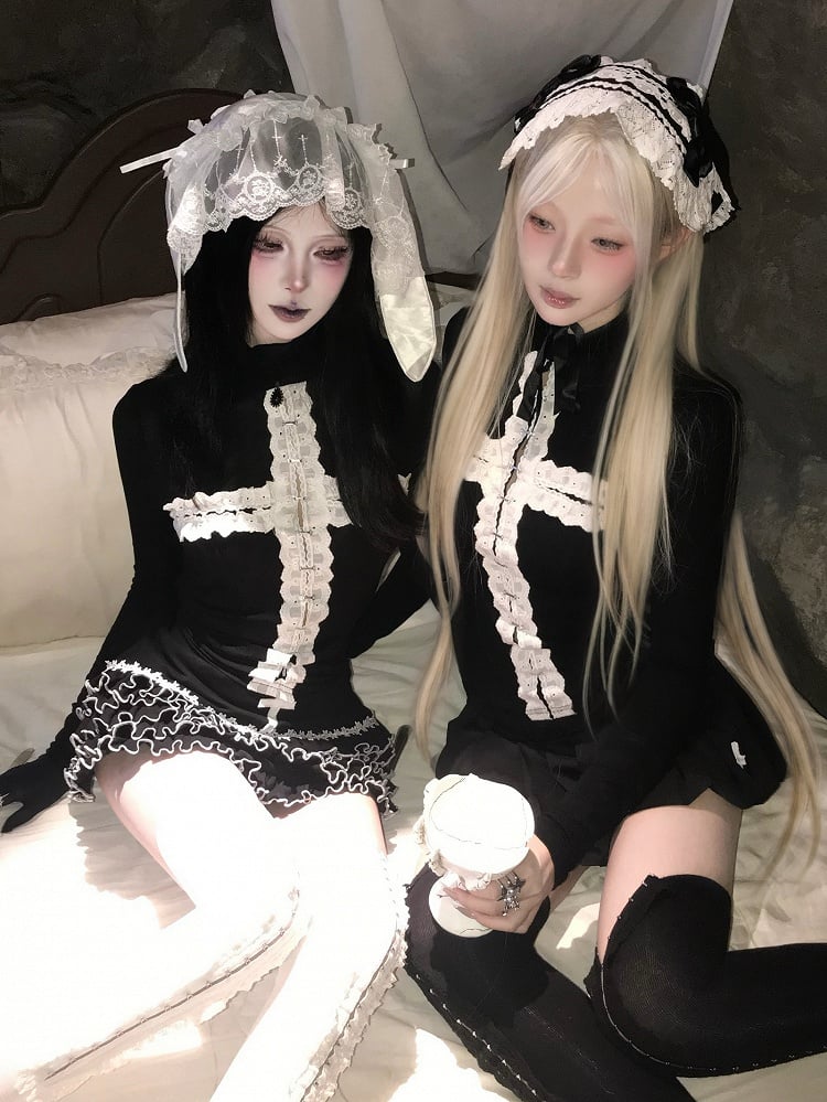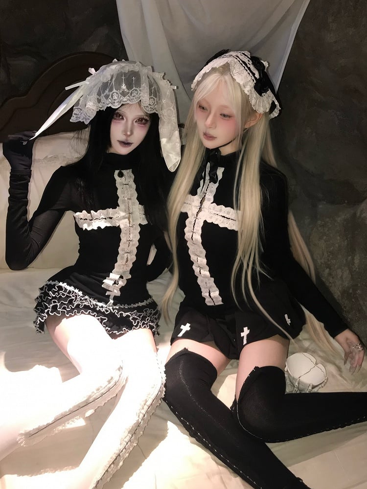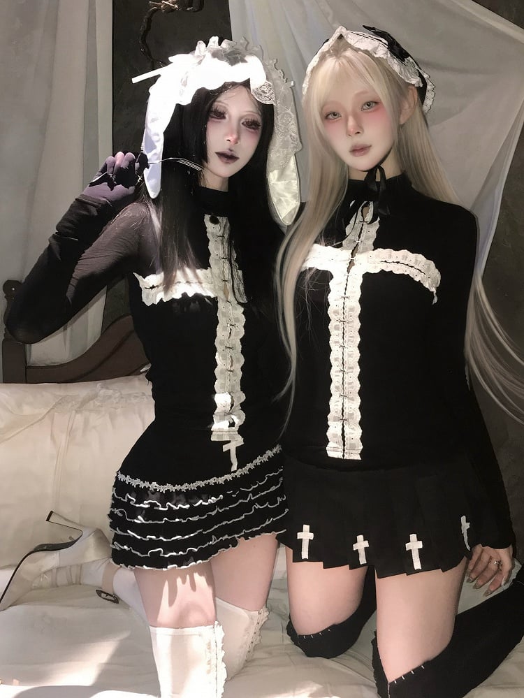 Gothic Sleeves Black Top with Long Options Motif Regular/Thinner High Cross Neck - Decorative