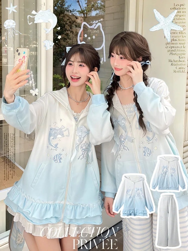Gradient Blue & White Jellyfish and Dolphin Print Ruffled Trim Zip Closure Hoodie