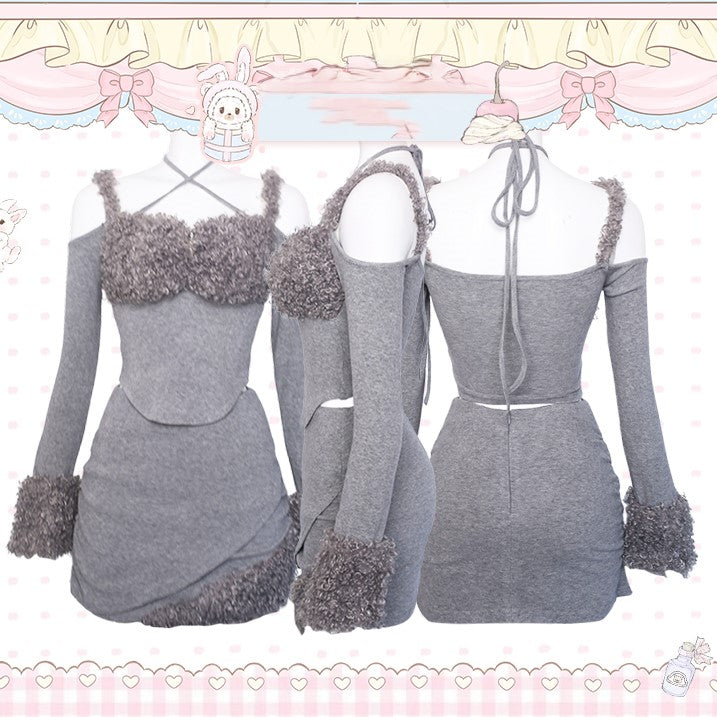 Gray Off-the-shoulder Top with Plush Cuffs & Metal Cross