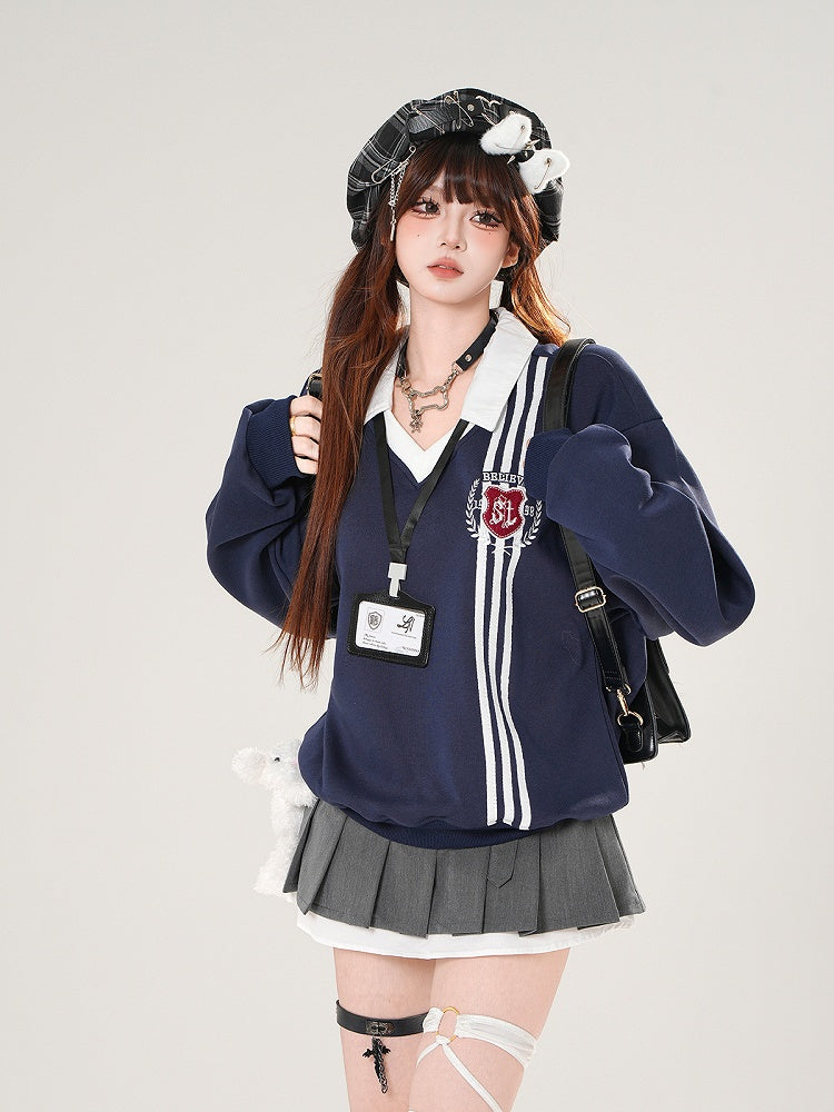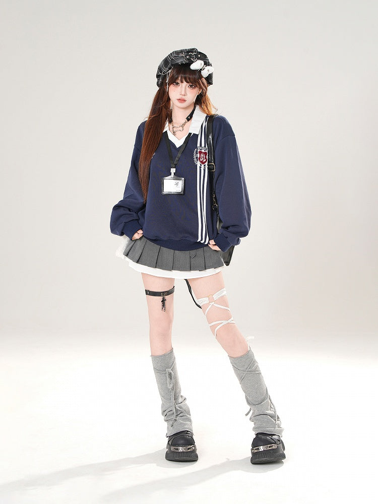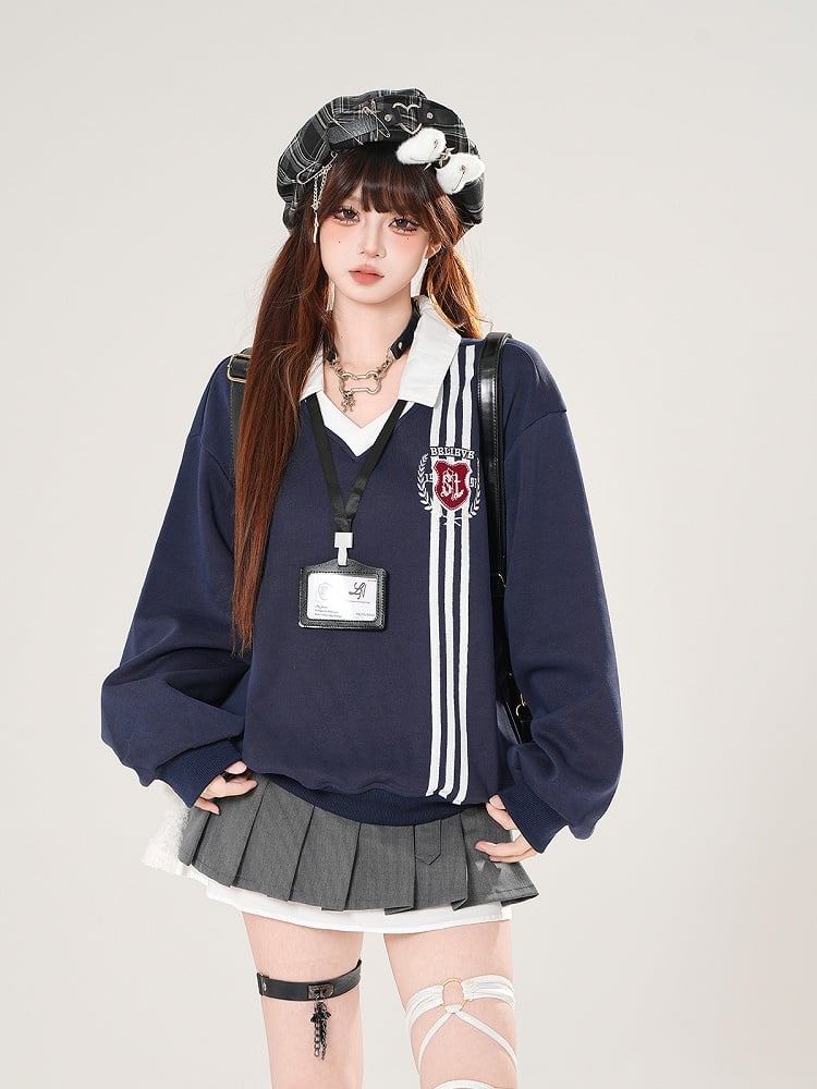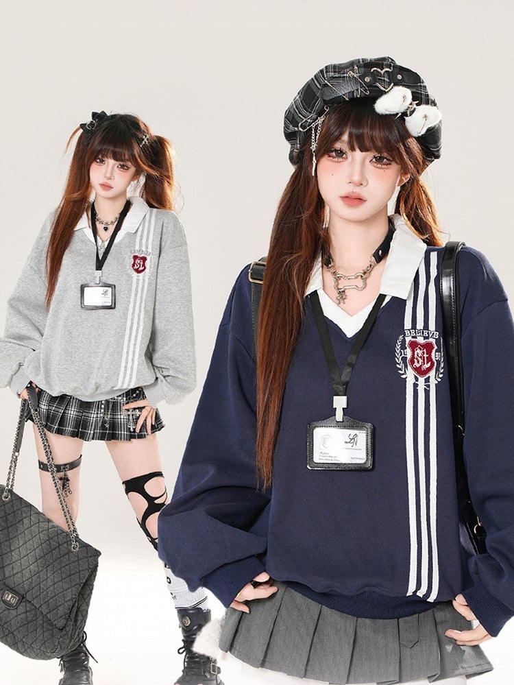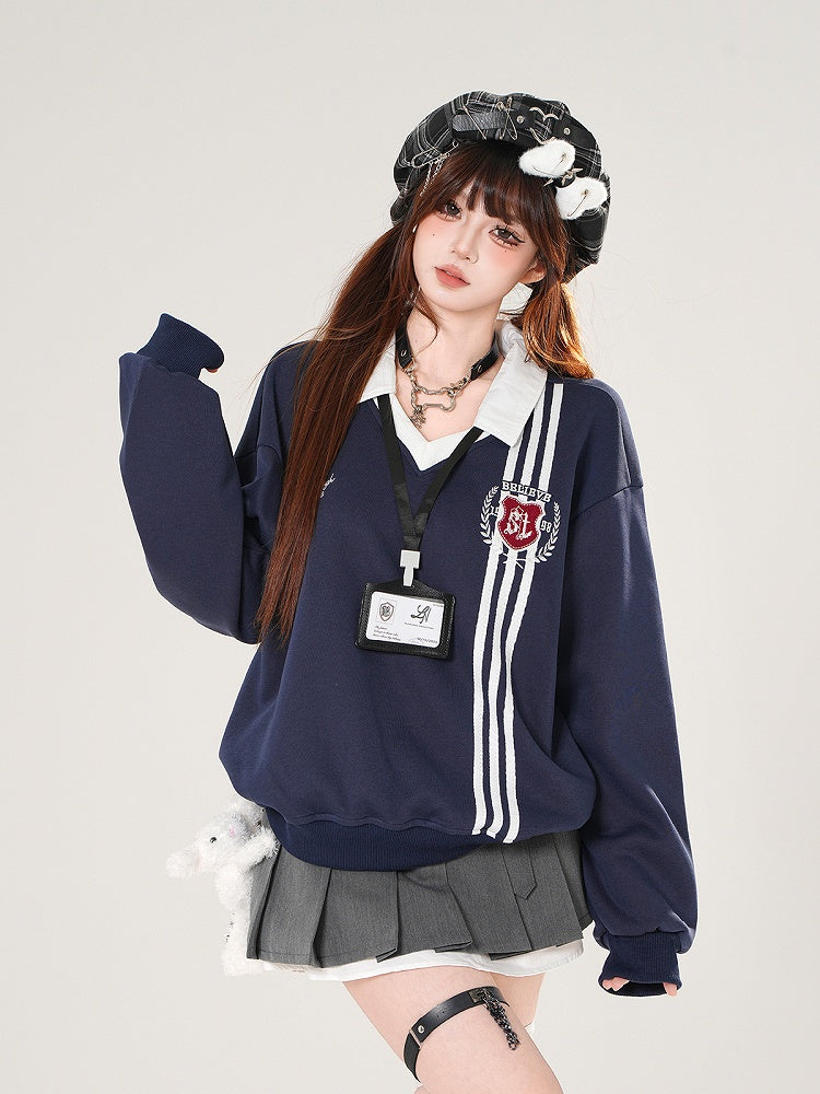 Gray/Navy Blue Classic Collegiate Polo Sweatshirt with Embroidered Crest