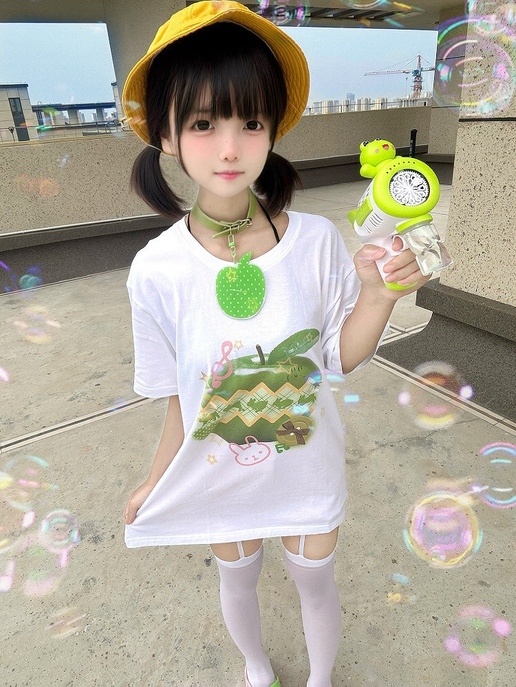 Green Apple Print White Round Neck Cotton T-Shirt Apple Choker Free with
