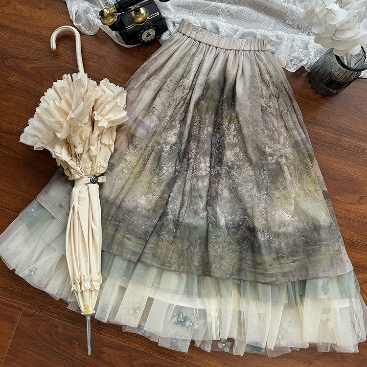 Green Oil Painting Print Flowers Tulle Hemline Lolita Skirt