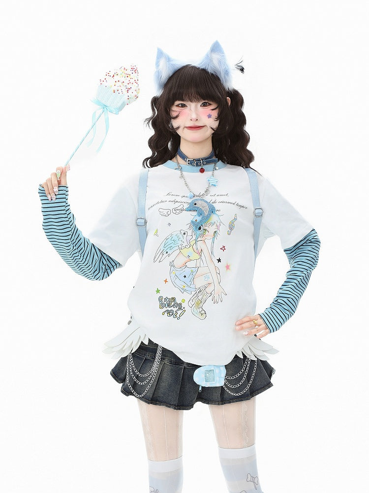 Green/White Sleeve Long Faux Two-Piece Top Y2K Cartoon Striped Print