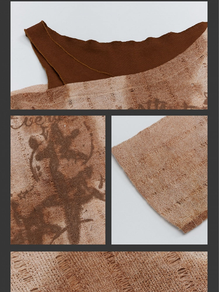 Grey/Brown Butterflies Asymmetrical Neckline Tie Dye Top
