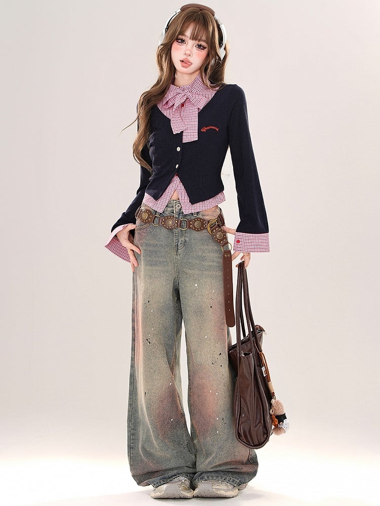 Grey/Navy Blue Plaid Patchwork Faux Two-piece Cardigan
