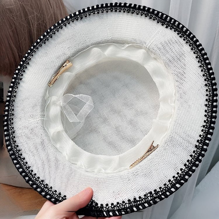 Black&White Beaded Heart Decorated Bowknot Lace Trim Elegant Hat