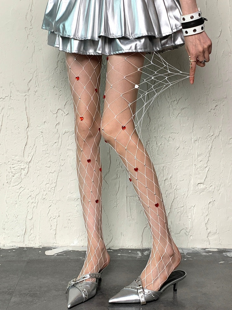 White/Black Y2K Rhinestone Decorated Heart Details Fishnet Tights