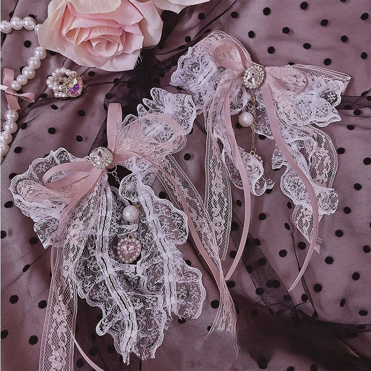 Heart Pendant Lace Bow Hairclip Rhinestone with Black/Pink