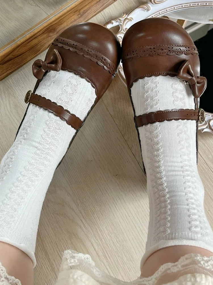 Scalloped Hem & Cutout Details Sweet Chocolate Brown Mary Janes with Detachable Bows