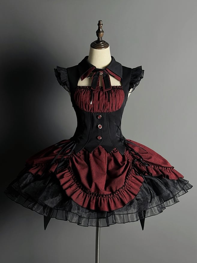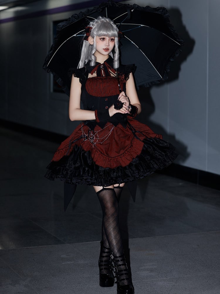 Red and Black Boned Waist Drawstring Striped Pattern Hem Halloween Gothic Lolita Dress