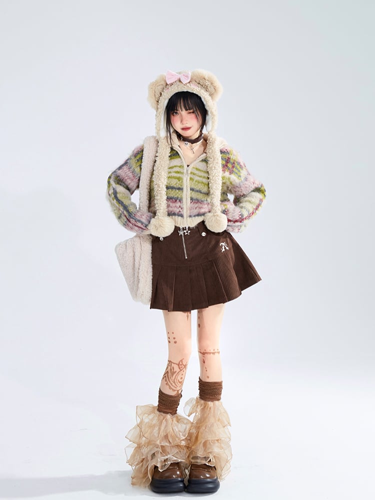 High Neck Cardigan Striped Green Closure Mohair Zip Crop Vintage with