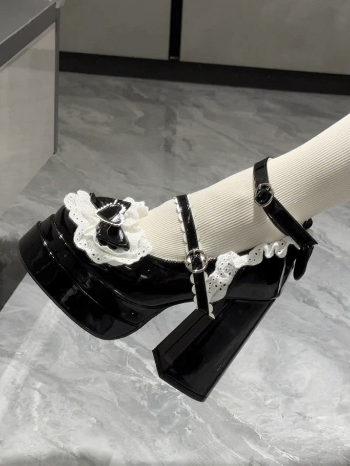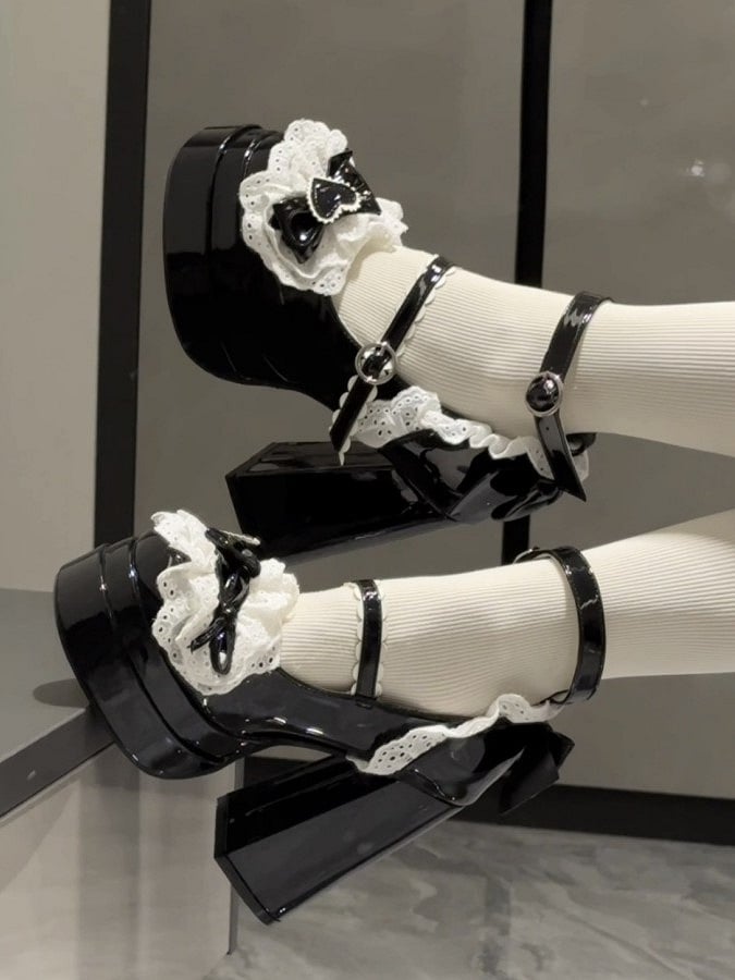 High Strap Platform Decor Block Black Bow Scalloped Lolita Heels with Sweet