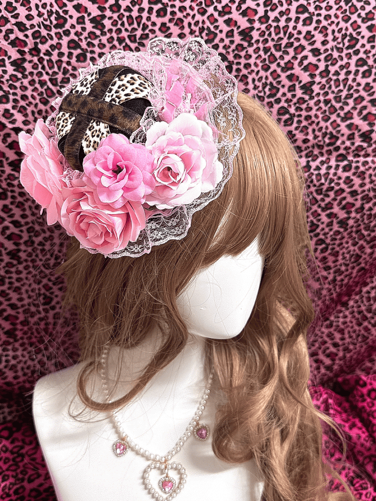 Hime Gyaru Leopard Print Pink/Rose Red Mini Hat with Opulent Rose & Ruffled Lace Trim