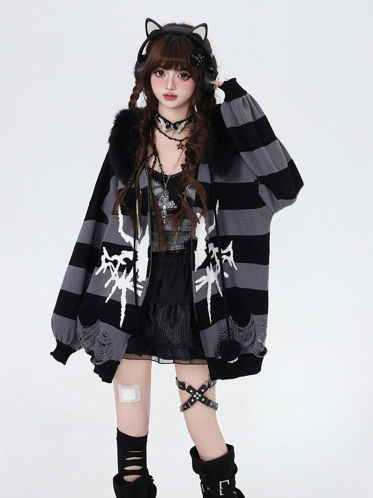 Hooded Striped Gray Fur Detachable Faux Zip Trim Punk Black with Sweater