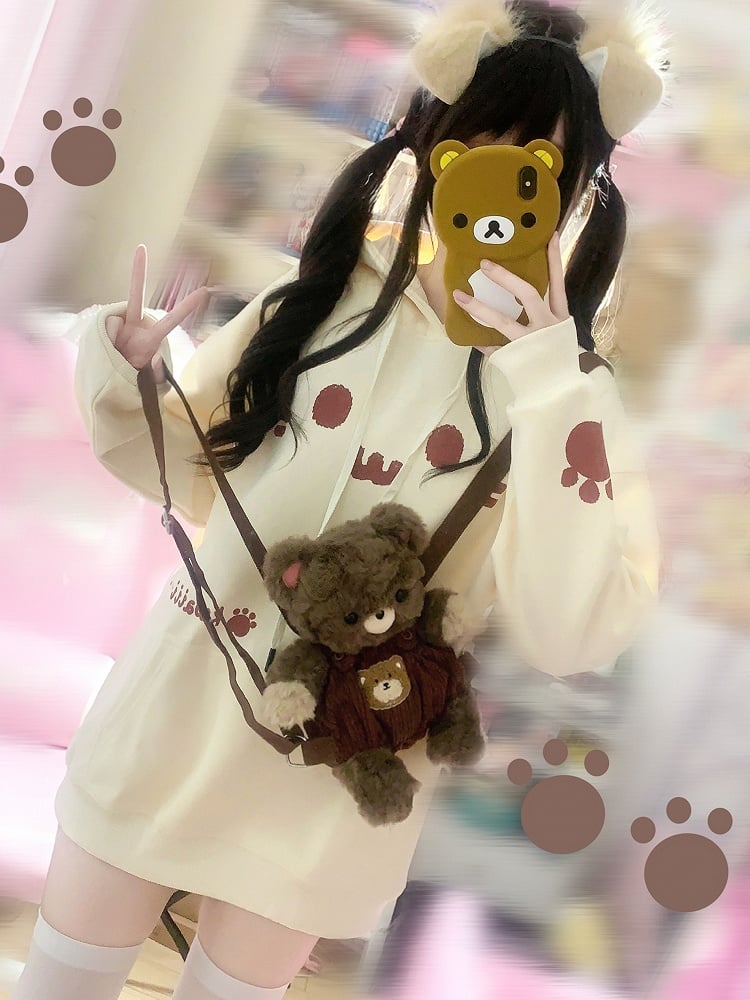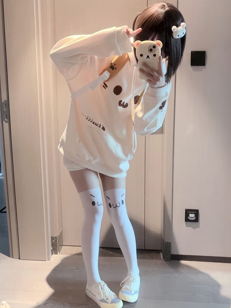 Hoodie Front Pouch with Themed Print Cat Pocket Off-white