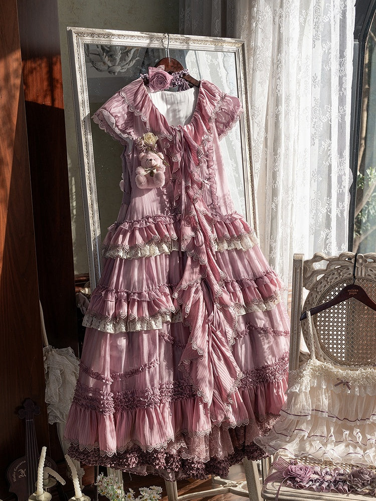 Purple Front Self-tie Straps Cascading Ruffle Placket Pink House Style Lolita Dress