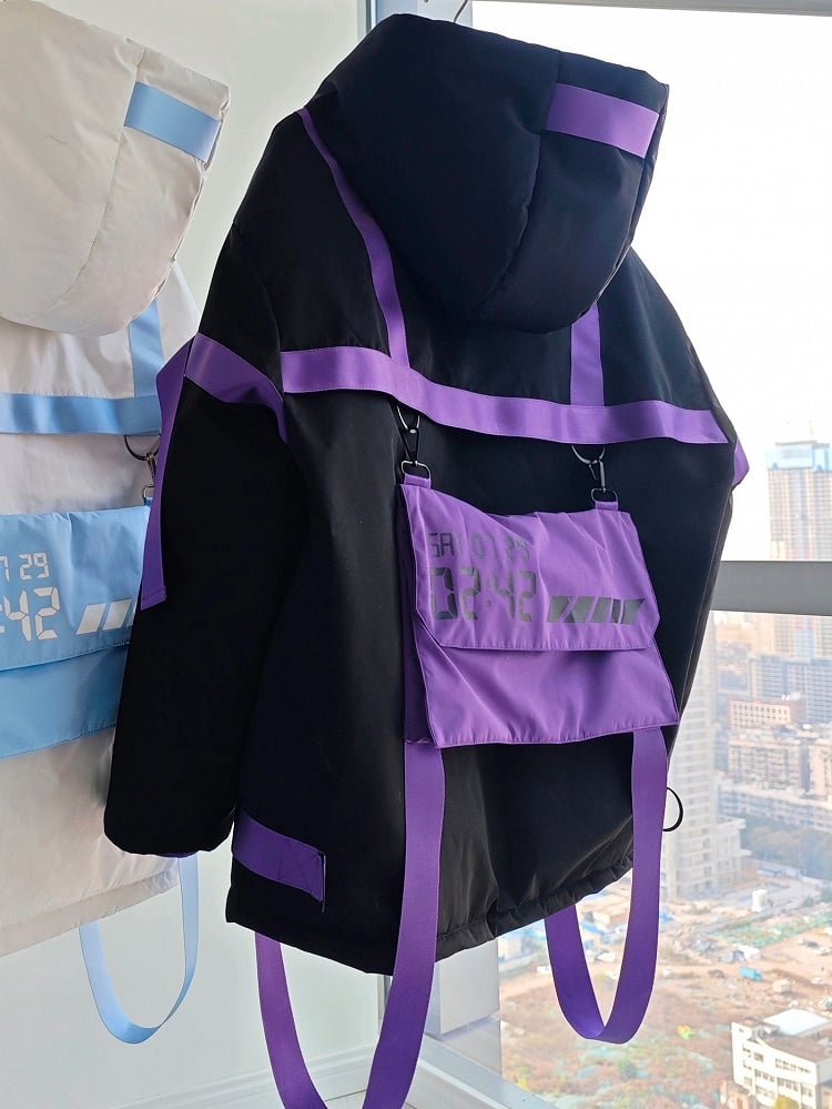 Cyberpunk Jirai Kei Puffer Jacket - Black Base with Purple Tactical Straps