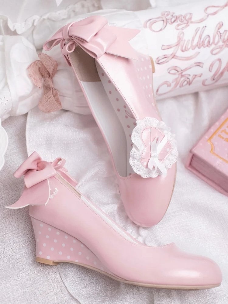 PU Pink Sweet Lolita Wedge Mary Janes - Detachable Lace Trimmed Heart, Bow Accents & Polka Dot Heel