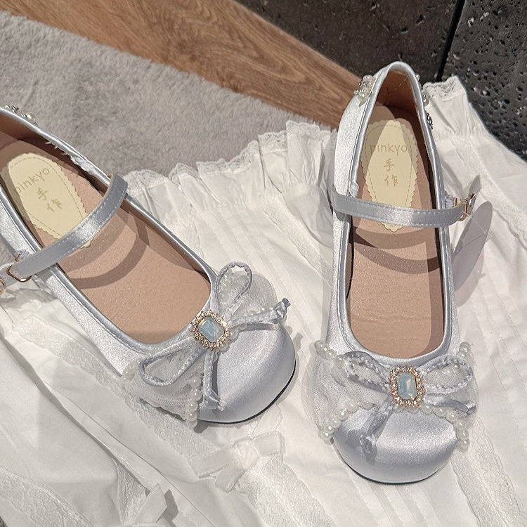 Mid-heel/High-heel Sweet Lolita Silver Mary Janes with Bow Details & Beads Accents