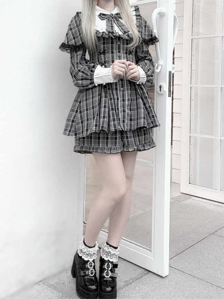 Jirai Bow + Long-Sleeve Dress Tie Design Matching Kei Shorts Set Grey Cape Lace-Up Plaid