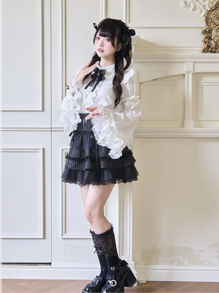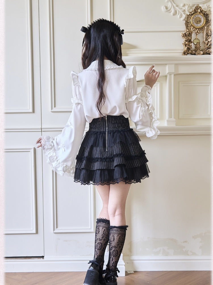 Jirai Kei Peter Collar Bowknot Sleeves Ruffled Lace Gothic Lolita Pan Trim White Blouse with Detachable Bell